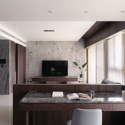 玄關隔屏櫃,上下挑空的櫃體設計,達到上視穿透視覺,下方保留開闊;讓自然光線也能穿透到玄關區域;而整體玄關區以華麗石材和深色木皮裝飾鍍鈦金屬,帶入現代感與低調奢華的空間氛圍。公領域客廳與書房區域,以深色木紋的半高隔屏界定區域;使沙發有了背靠,化解風水上的疑慮;書桌區上方的大樑,不刻意包覆;巧妙應用作為天花區域照明;為增加空間視覺延伸感;落地窗上緣延伸弧形修飾,以深色木紋包覆;線性照明,與鏡射使視覺延伸感加倍。臥房設計延續沉穩靜謐的氛圍營造;從屋主品味得知顏色喜好;挑選進口壁紙妝飾電視壁面與床頭背板門片;推拉門片隱藏大片窗,阻隔光線,白天也能休憩時,也能安心入眠。