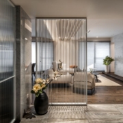 玄關隔屏櫃,上下挑空的櫃體設計,達到上視穿透視覺,下方保留開闊;讓自然光線也能穿透到玄關區域;而整體玄關區以華麗石材和深色木皮裝飾鍍鈦金屬,帶入現代感與低調奢華的空間氛圍。公領域客廳與書房區域,以深色木紋的半高隔屏界定區域;使沙發有了背靠,化解風水上的疑慮;書桌區上方的大樑,不刻意包覆;巧妙應用作為天花區域照明;為增加空間視覺延伸感;落地窗上緣延伸弧形修飾,以深色木紋包覆;線性照明,與鏡射使視覺延伸感加倍。臥房設計延續沉穩靜謐的氛圍營造;從屋主品味得知顏色喜好;挑選進口壁紙妝飾電視壁面與床頭背板門片;推拉門片隱藏大片窗,阻隔光線,白天也能休憩時,也能安心入眠。