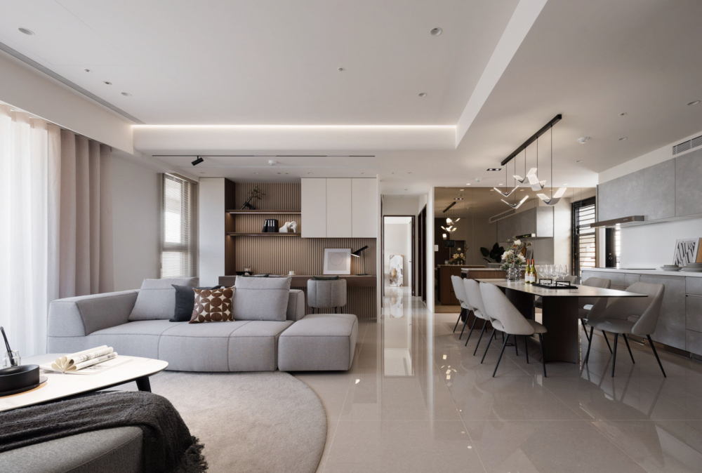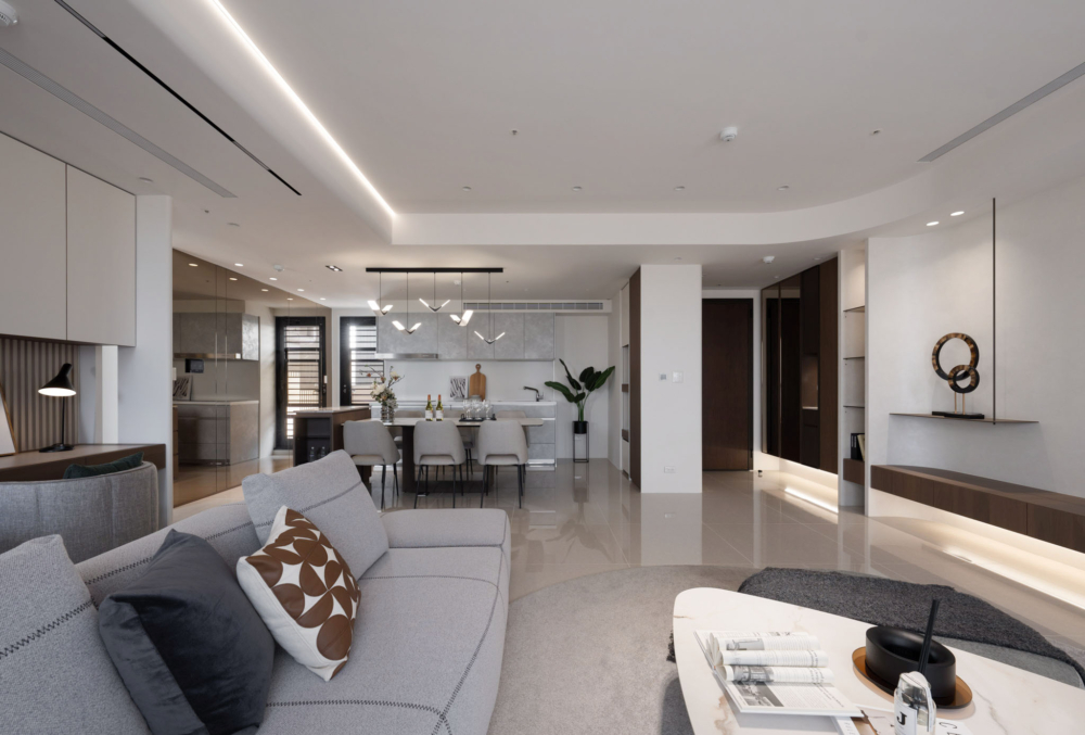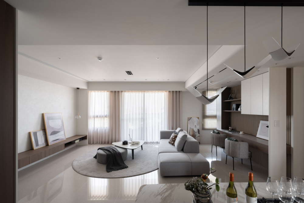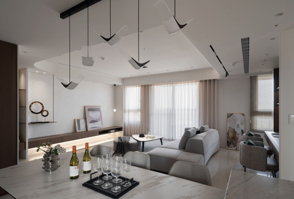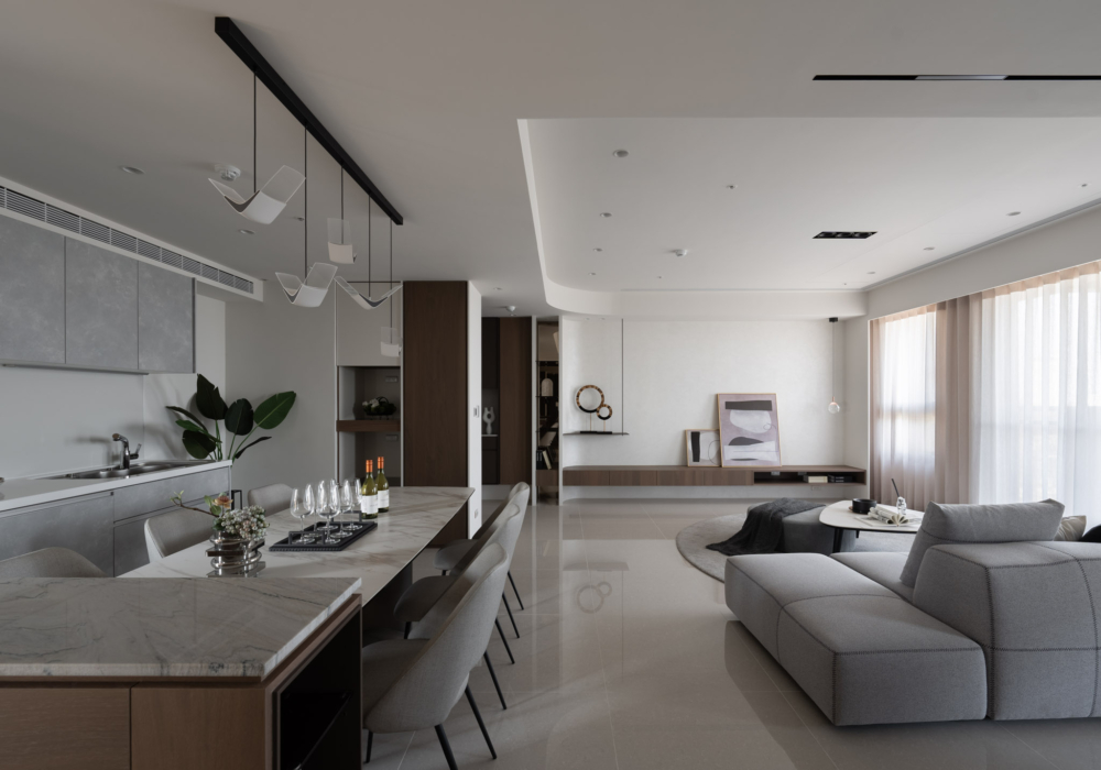 空間色彩以米灰白配置,散發內斂優雅的氣息;充滿藝術手感的藝術漆牆面,光映變化為客廳主牆帶來藝術氛圍;通透寬敞的公領域,串聯客廳、書房與餐廳;視覺景深延伸,搭佐書房壁面灰棕調木質格柵;烘托出溫潤質感,為生活日常留下暖心溫度。餐廳小型島櫃連結餐桌,滿足機能需求,更放大空間尺度;如同飛鳥展翅的餐吊燈飾,增添空間層次與亮點,飛往窗外山湖蒼翠景緻;曠志怡神的心境界。
