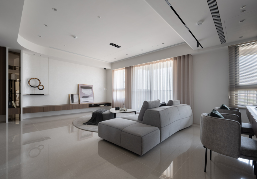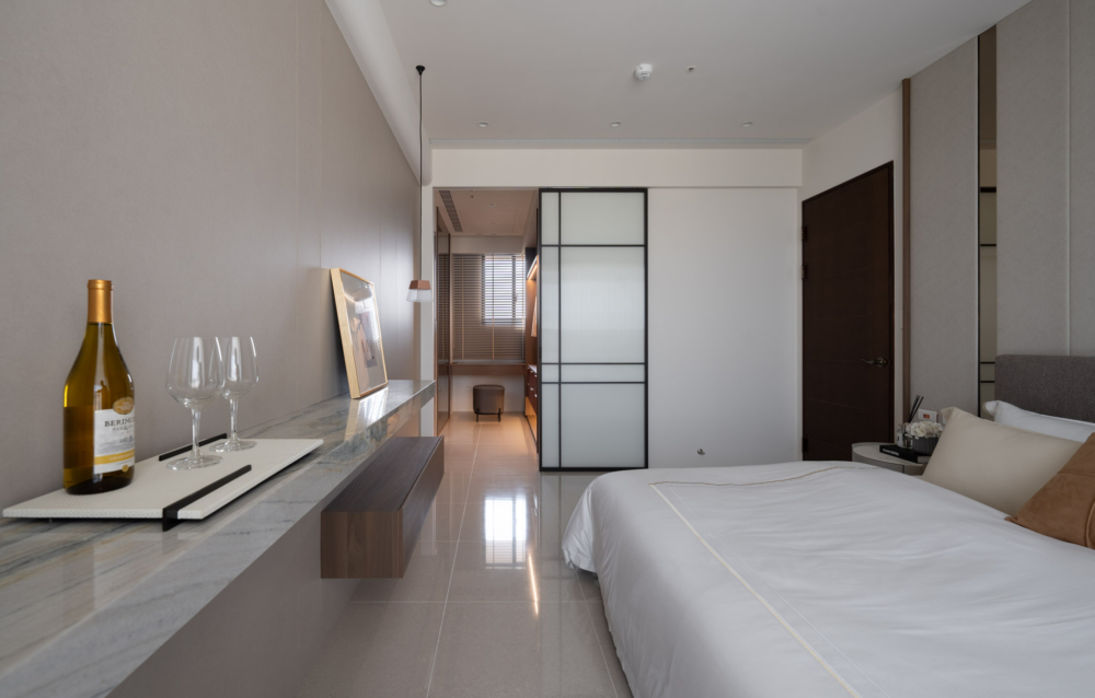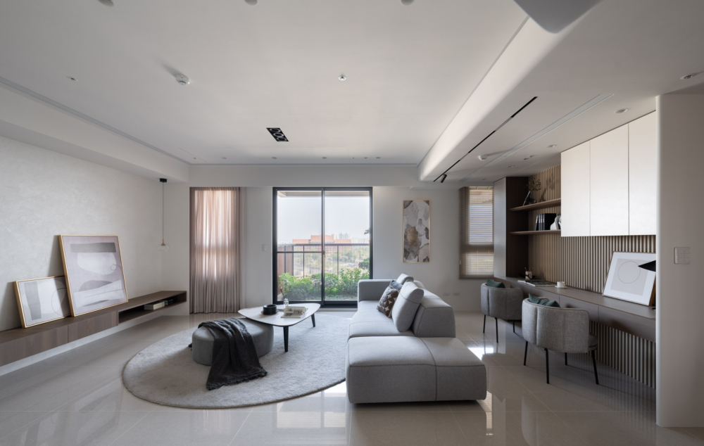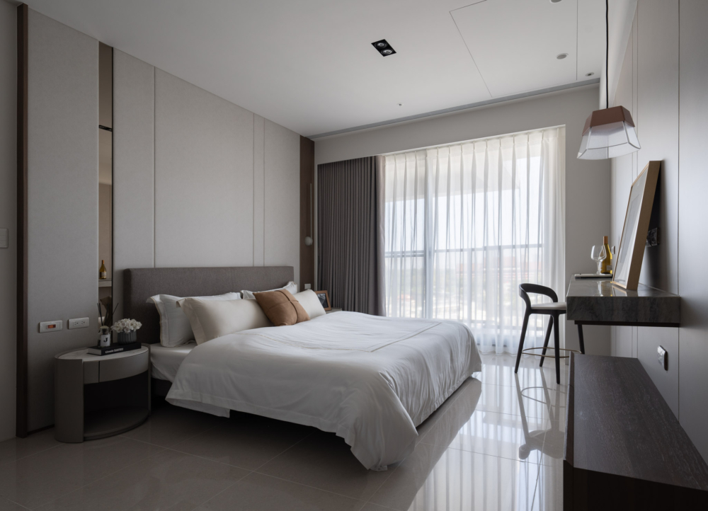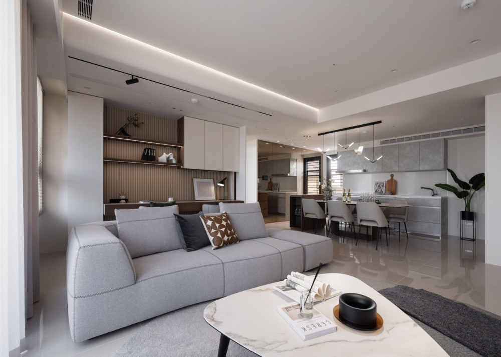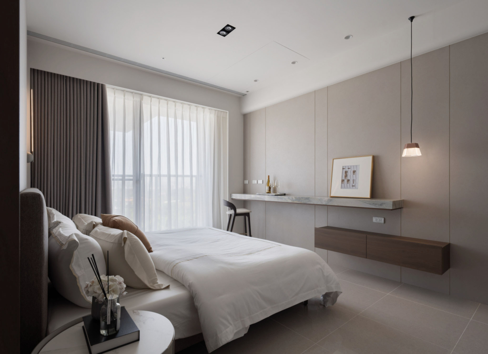 空間色彩以米灰白配置,散發內斂優雅的氣息;充滿藝術手感的藝術漆牆面,光映變化為客廳主牆帶來藝術氛圍;通透寬敞的公領域,串聯客廳、書房與餐廳;視覺景深延伸,搭佐書房壁面灰棕調木質格柵;烘托出溫潤質感,為生活日常留下暖心溫度。餐廳小型島櫃連結餐桌,滿足機能需求,更放大空間尺度;如同飛鳥展翅的餐吊燈飾,增添空間層次與亮點,飛往窗外山湖蒼翠景緻;曠志怡神的心境界。