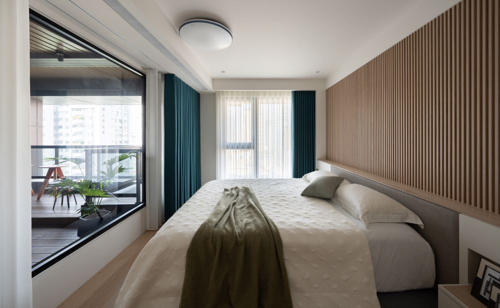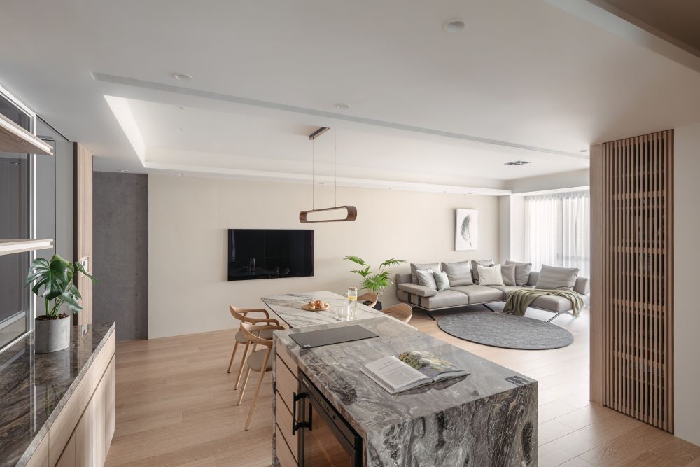 以樸素而原始的仿清水模塗料以及帶點微顆粒質地的珪藻土塗飾牆面,兩種不同簡單極致的素材,手作的質感工藝,展現相同低調又質樸的美感,木皮自然紋理元素融合整面電視牆與地面,與木格柵造型櫃牆,視覺中呈現的和諧之美,從簡單設計中,構思出淡雅簡約,舒適內斂的家居風格。