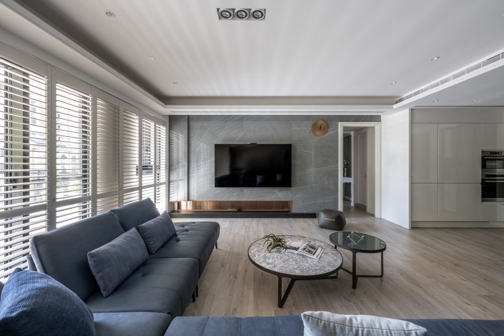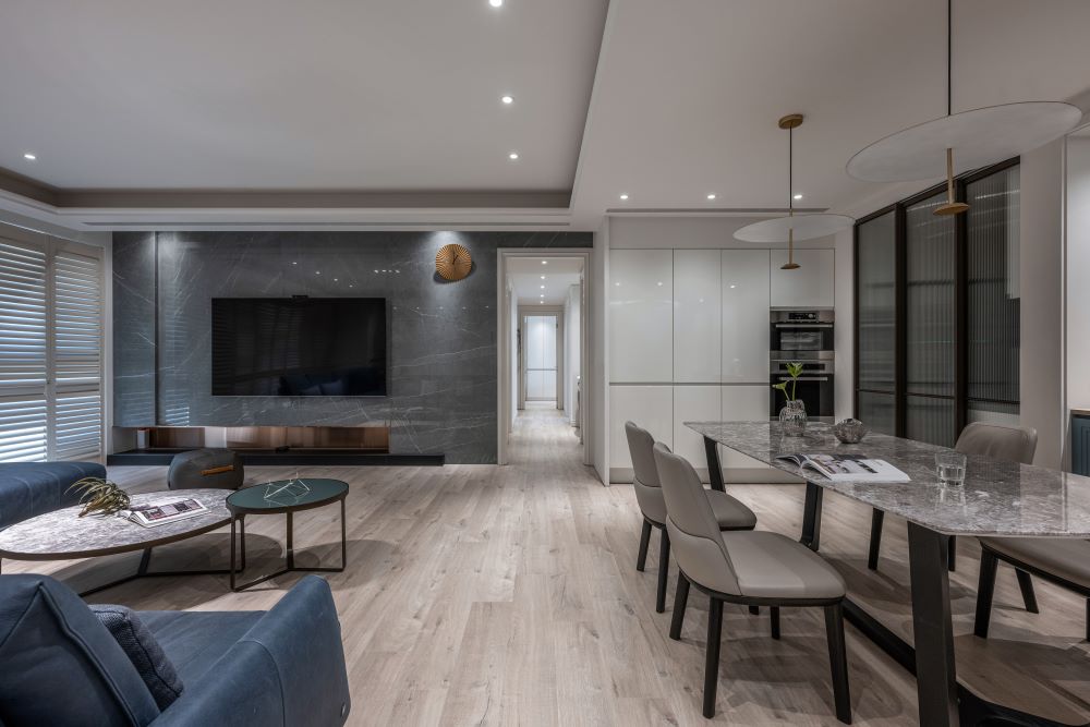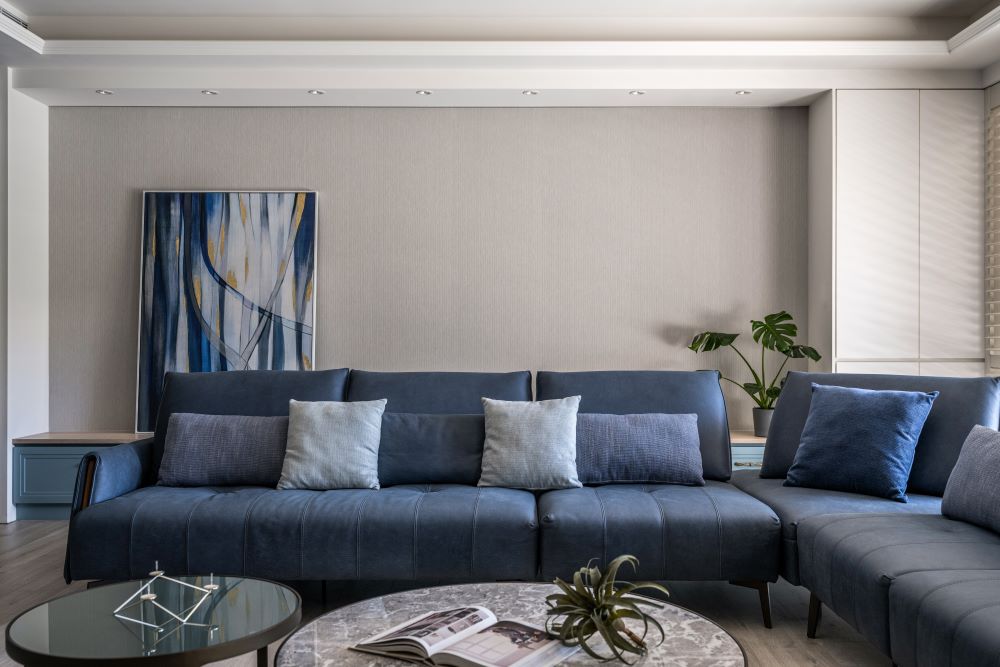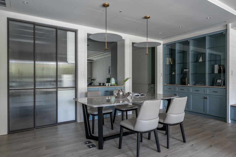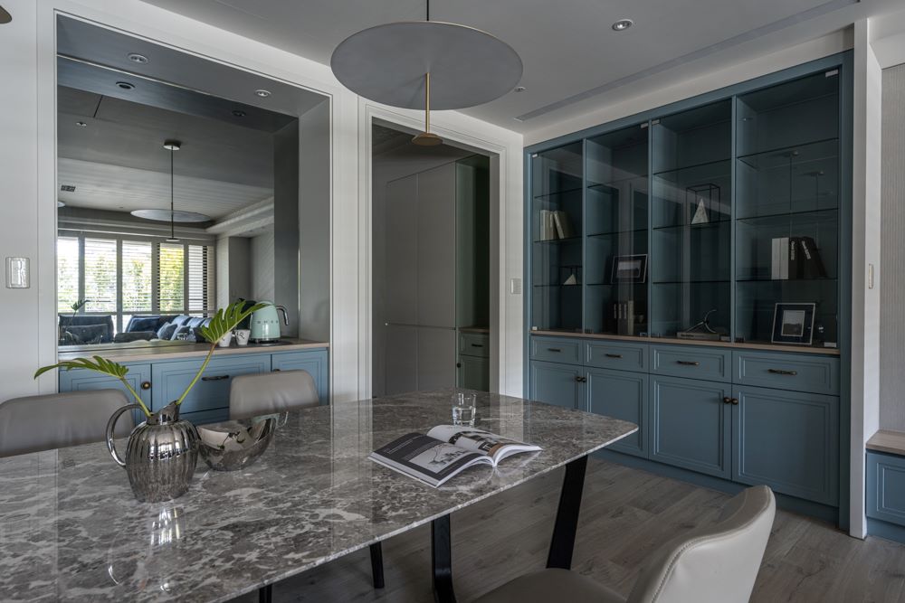 冷灰調石材紋理與冰河藍的俐落櫃體,紳士藍的沙發,讓主要場域空間氣派與優雅融合其中,細心挑選的軟裝配件與生活品味選物,美好生活立現。 格局調整廚房牆面規劃出獨立的衣帽間,滿足屋主生活上需求,空間廊道引領進入主要場域,空間元素帶出飯店高質感,優雅知性美感與舒適生活氛圍。