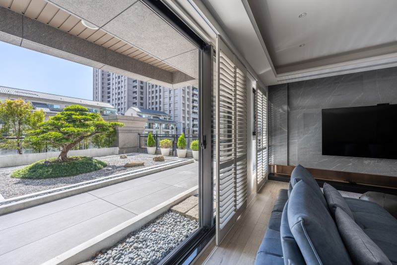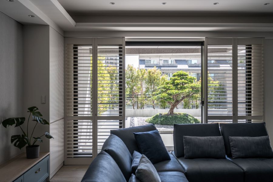 玄關花卉圖騰壁紙作為天花裝飾,絲蘭的粉綠色調,為空間帶來一股薄荷綠的清新感,純淨又療癒,與現代感的懸掛主燈,帶入居家品味的都會時尚感。客廳以造型與透光性的木百葉,連續性的展開,呈現出濃厚的美式格調,放大空間的視覺效果加乘,讓日光穿透室內,自然營造休閒度假氛圍。推開整面的木百葉,戶外的大露臺,日式枯山水設計,真柏矗立在庭園中,帶來安定沉穩的力量。