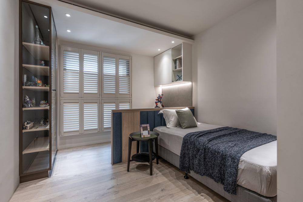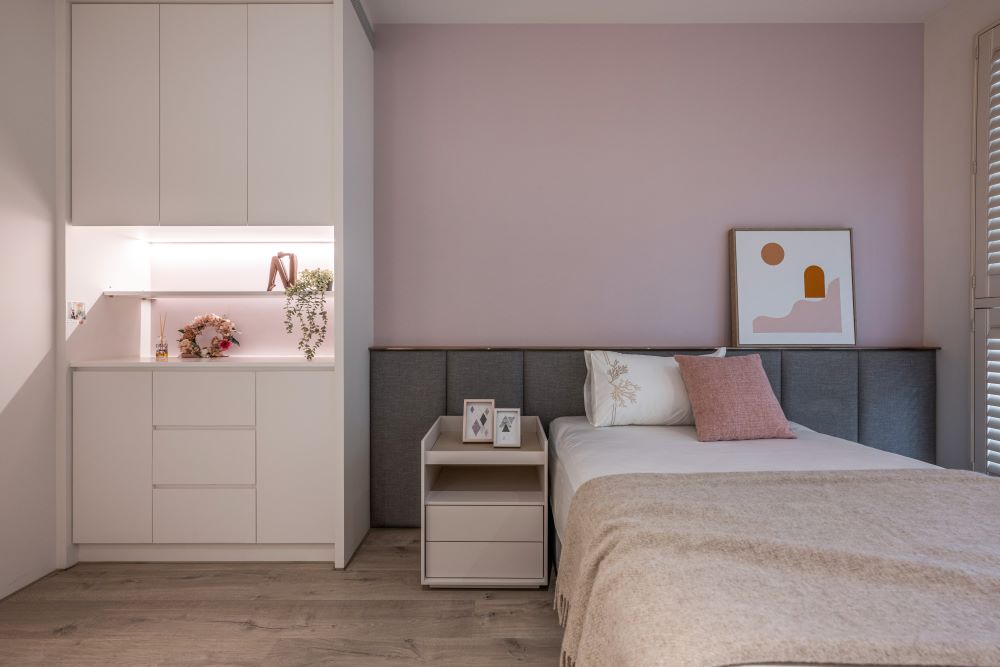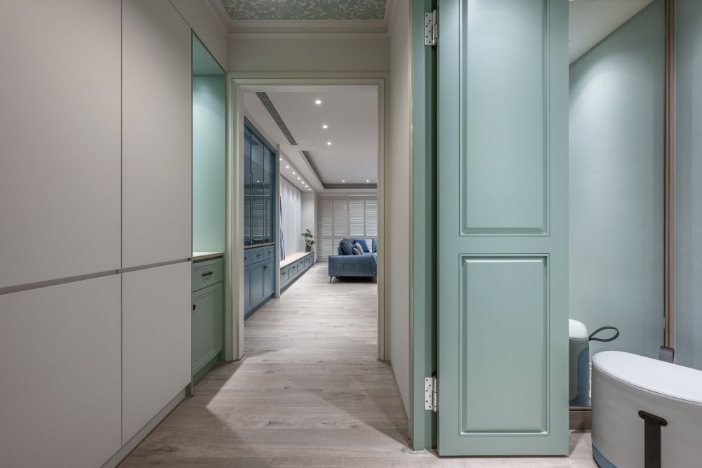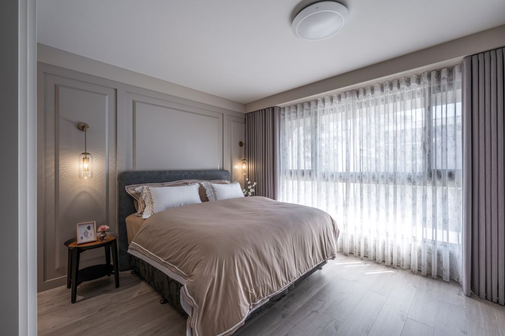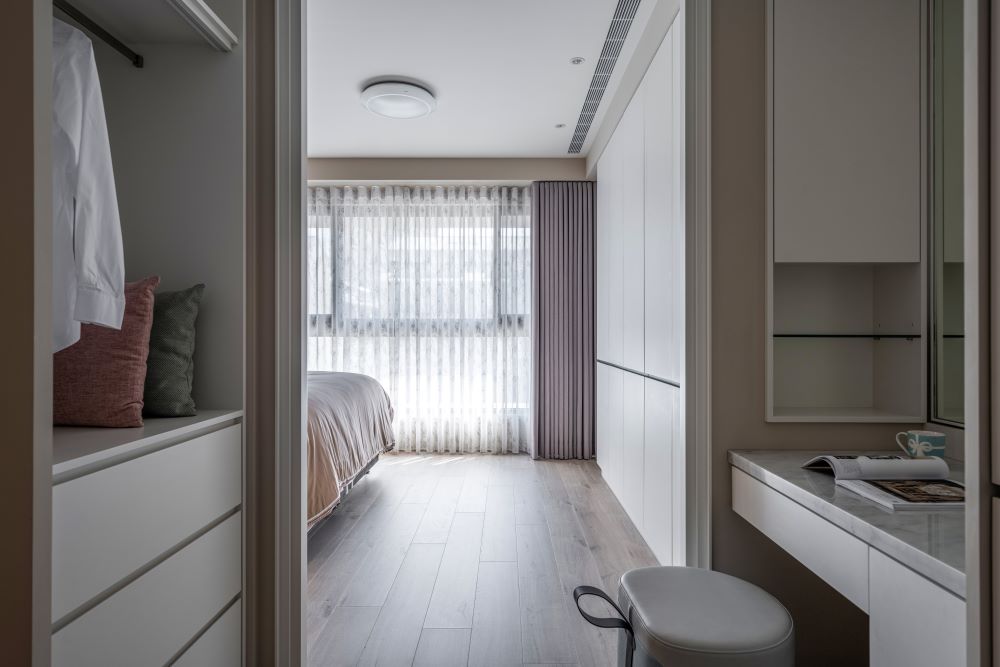 以美式現代為設計核心美學基底,簡潔不繁複的線板裝飾,妝點在收納門片上,從玄關延續到客廳以及私領域的主臥壁面設計,立體線條佐以柔化色彩,使居家空間增加細膩質感,與唯美氣質。